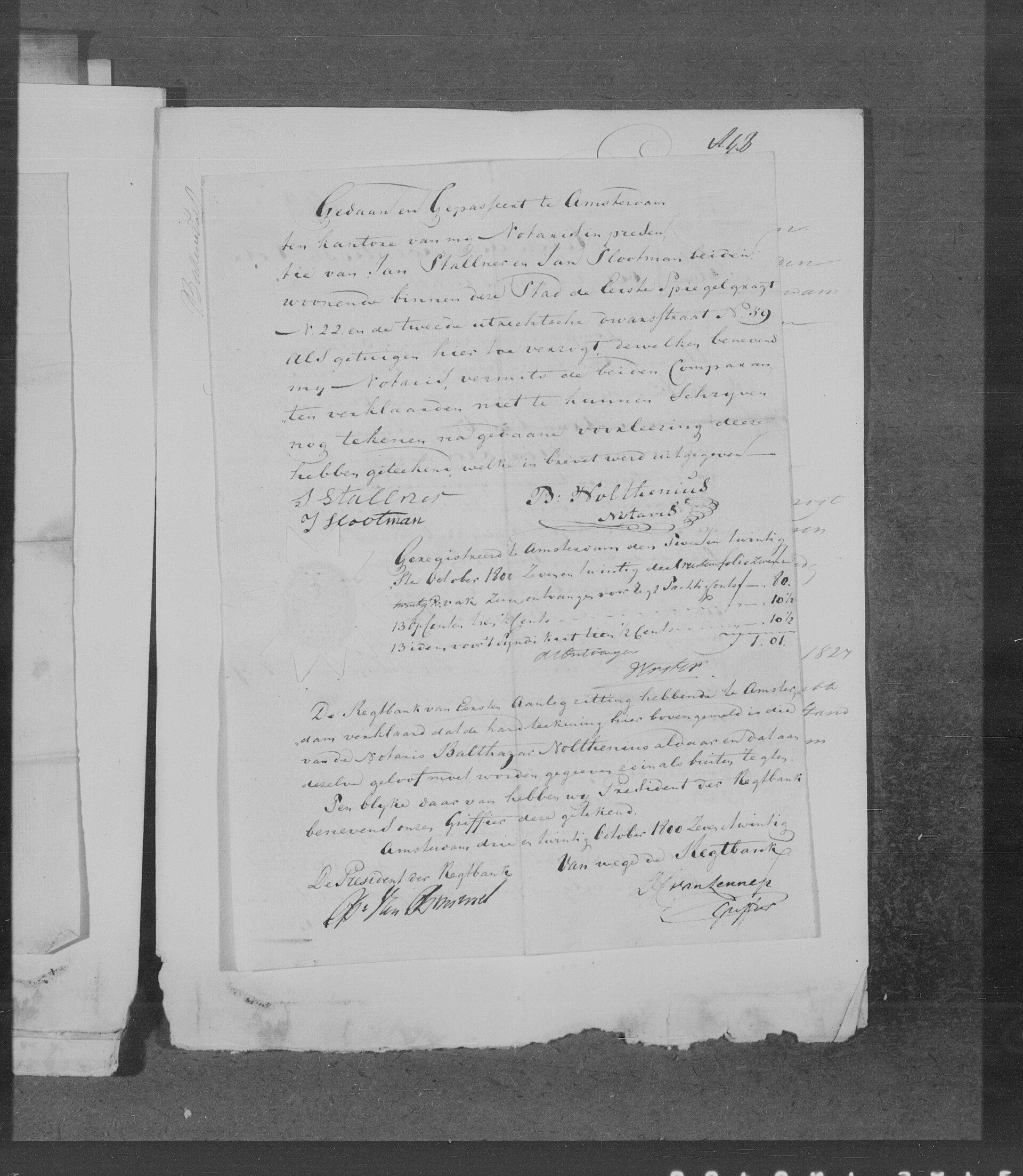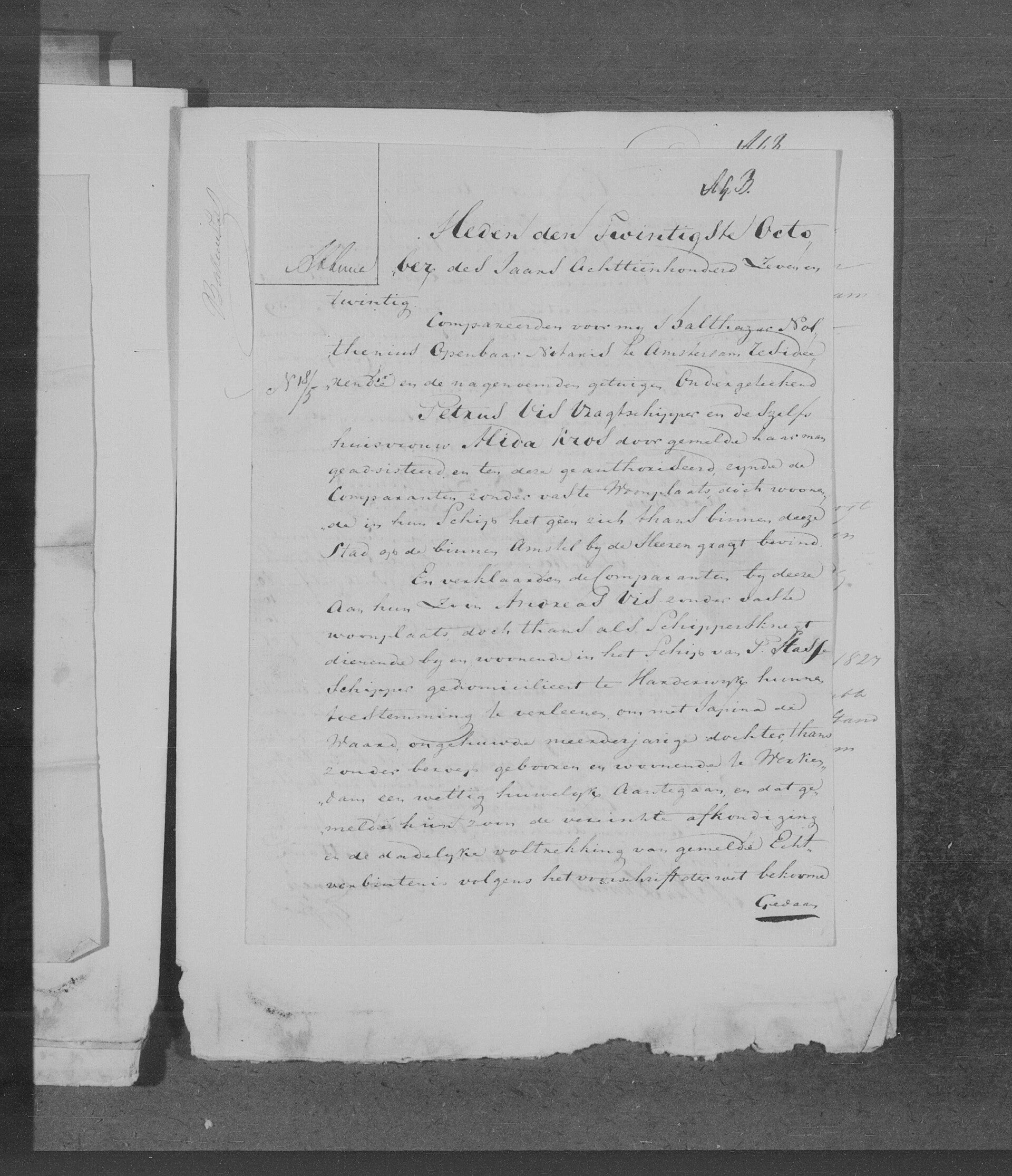 *Heden den Twintigste October des Jaars Achttienhonder zeven en twintig-Compareerden voor mij Balthazar Nolthenius Openbaar Notaris te Amsterdam residerende en de nagenoemden getuigen ondergeteekend