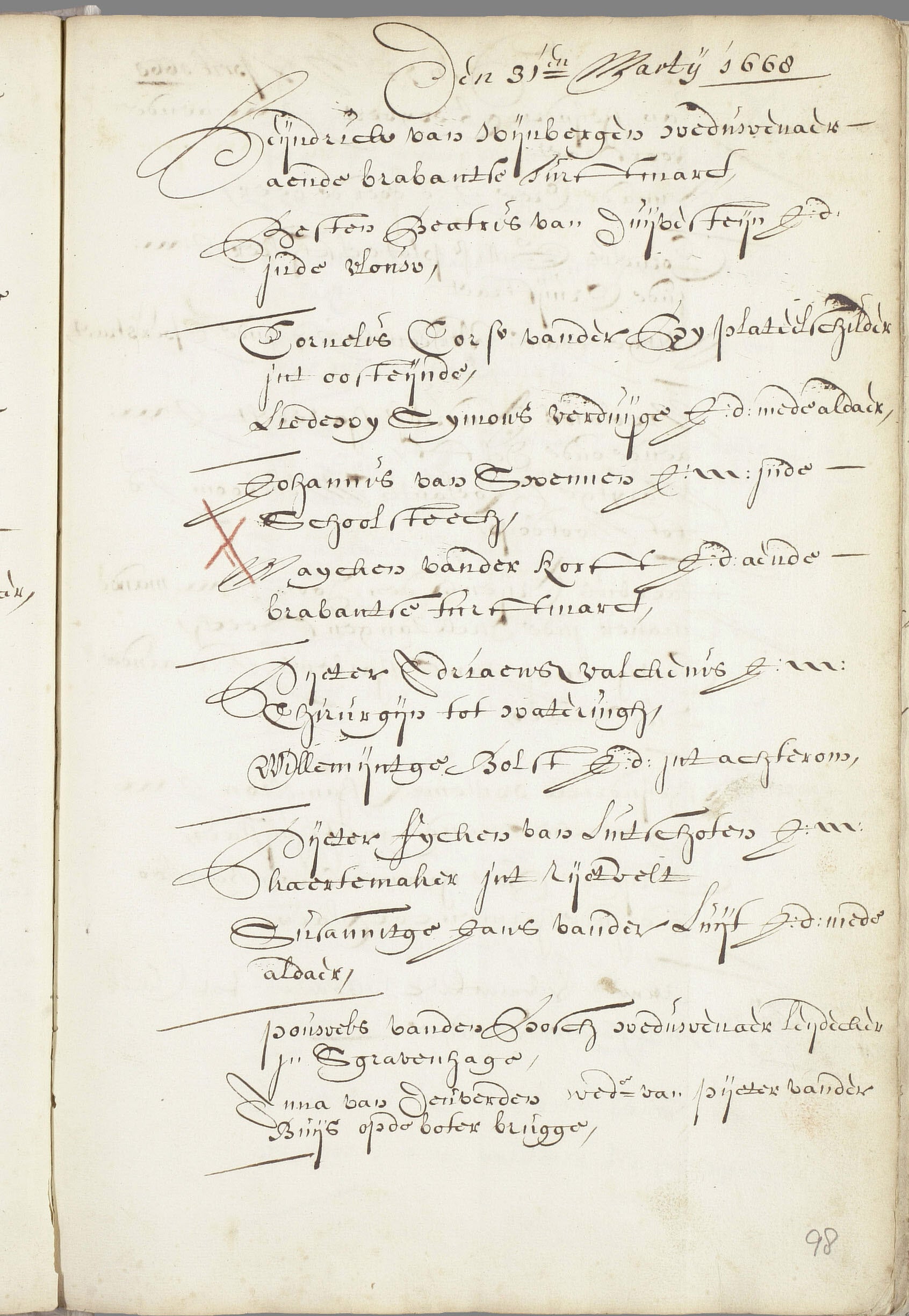 98 Jan Willemsz Floor en Leuntje Jans Laij, herbergiers in de Valk te Oostvoorne verzekeren tbv. de diaconie aldaar een schuld van f 400 (wegens tenietdoening van een obligatie, door Jan Gerritsz Noordermeer als beschadigde borg voor comparanten op 26-8-1680 gepasseerd tbv. Jan Pietersz Bockesteijn) op genoemde herberg, belast met f 2 per jaar tbv. de Armen van Oostvoorne