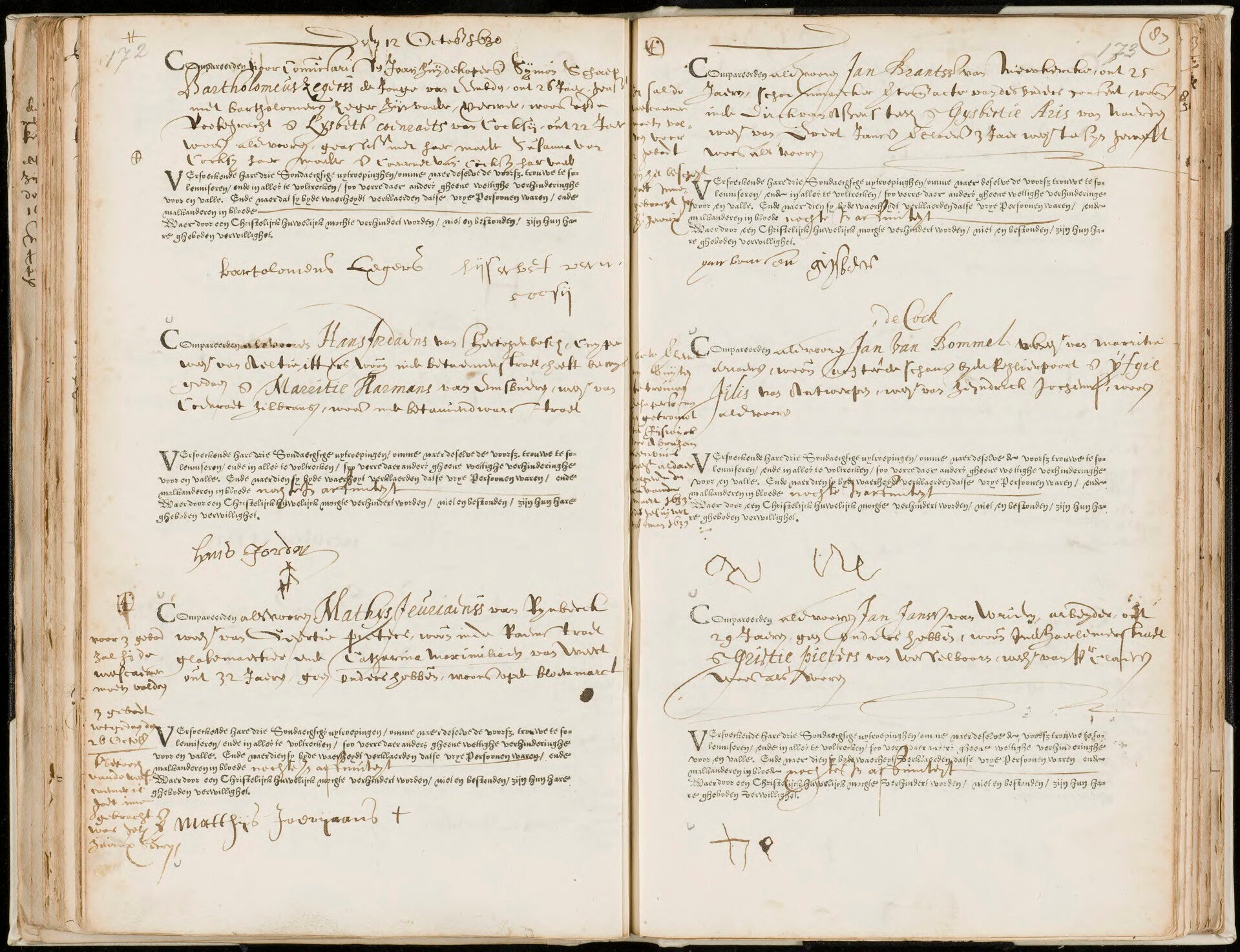 ‘Stolkwijck, Martius 15 1659 Bouwen Jacobsen J.M. uijt den achterbroek Marichie Jacobs j.d. van Stolwijck, zijn bij ons wettelijcke ondertrout, tegenwoordich waren Jacob Dercksen vader van den Bruijdegom Jacob Jacobsen vader van de Bruijt III’