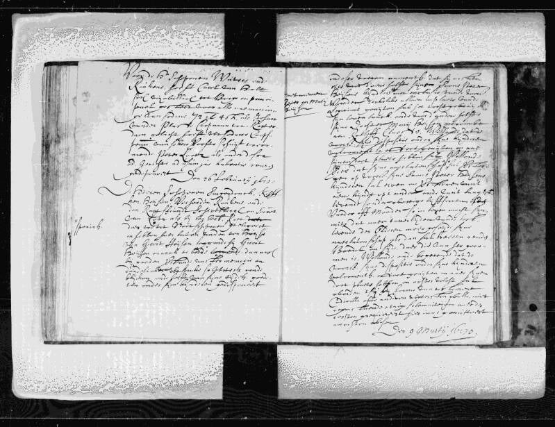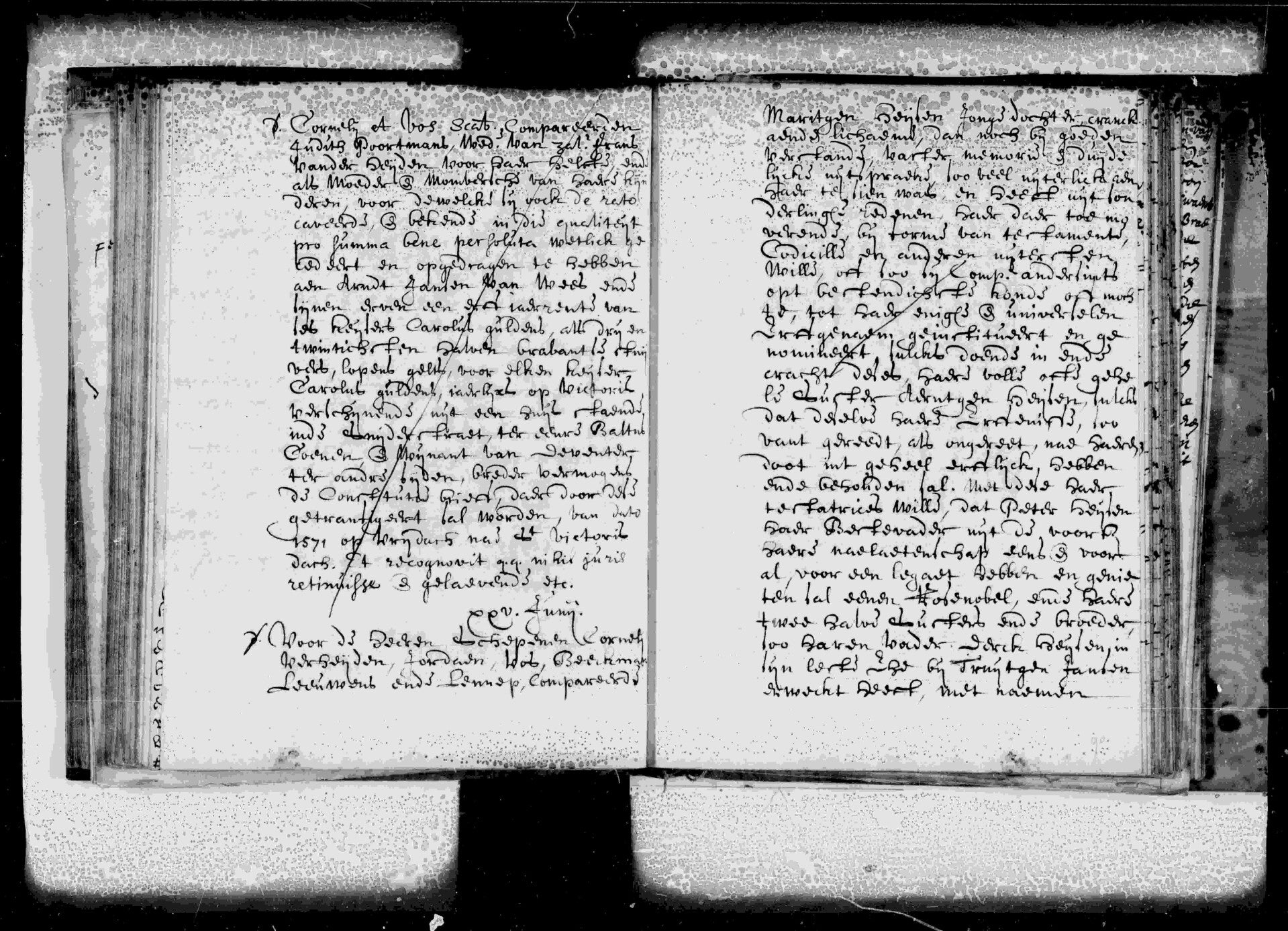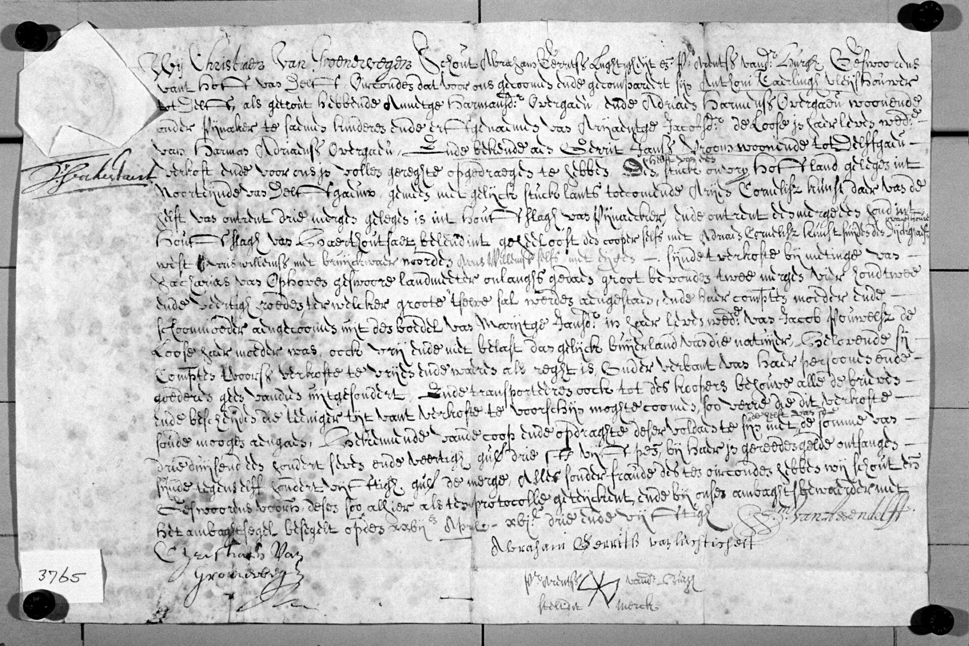 Op huijden den xvi meij 1628 compareerde voor mij Cornelis Pieck Nots pub ende nages getuijgen, Pieter Corstiaens Clooster wonende in den Briel, als neve van Leentgen Leenderts, minderjarich weeskindt van Leendert Wittes, mitsgaders als last ende procuratie hebbende van [Dijckgraeff ende schepenen van d'ambachtsheerlijcheijt van Streuijt] Witte Commers ende Sandrijntge Piers ende van Dijckgraeff ende schepenen van d'ambachtsheerlijcheijt van Streuijt [van] sijnde van date den xiiije deser maent, mij notaris ende voors getuijgen ter ... gelesen(?), de welcke verclaerde inde selve qualite geconstitueert ende machtich gemaect te hebben gelijck hij doet bij desen Christiaen Rhoon procur voor de voors hove vmeldt in de naem ende vanwegen hem constituant voor den selven hove ende elders daert van node wesen sal, te ageren ende recht te plegen op ende jegens eenen ijgelijcken in omnibus ad cites orim potestate substituendi in communiforma ende specialijcken jegens Corns Wittes Paling als oom ende voocht van't [nagelaten] voors weeskint [van Leendert Wittes, geprocreert bij Maertge Pieters] alle dagen ende terminen van rechte nae stijle ende usantie van den voors hove ende andere rechteren te observeren ende voorts generalijcken alles te doen wesen hij constituant selffs present ende voor oogen sijnde soude connen ofte mogen doen, al waert dat de saecke off saecken naderlast als voors staet requireerden gelovende voor goet vast ende van waerden te houden altgunt bij desen sijnen geconstitueerde tot gene voors es gedaen gehandelt ende gebesonigeert(?) sal worden onder 't verbant nae rechten daertoe staende. Aldus gedaen ende gepasseert te den Hage ten comptoire mijns Notaris ter presentie van d'Eersame Digman Doens ende Jan van Nock als getuijgen van goede gelove neffens mij Notaris ten desen gerequireert ten dage als boven,