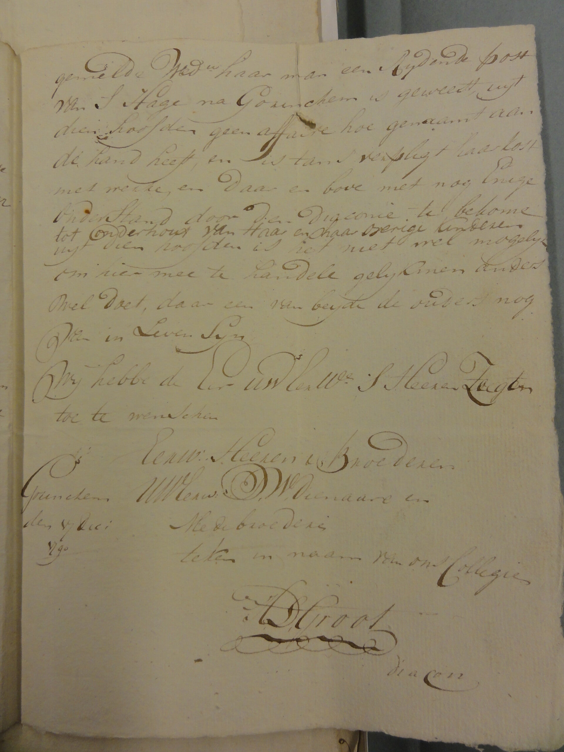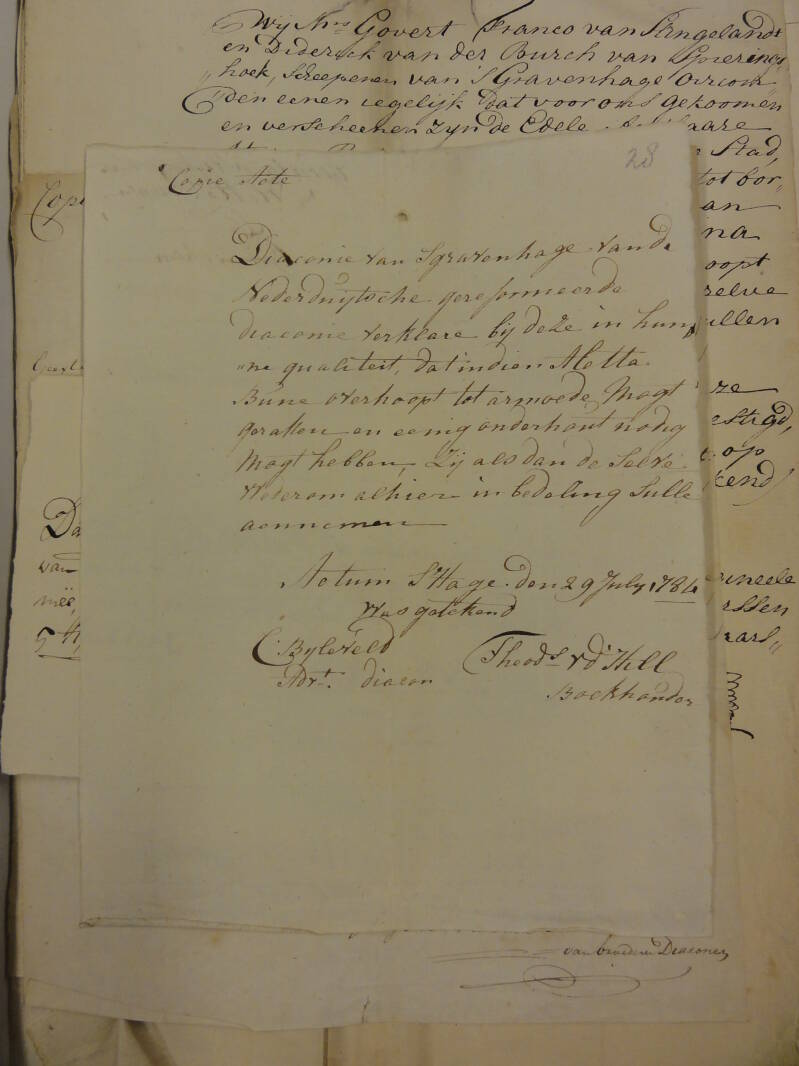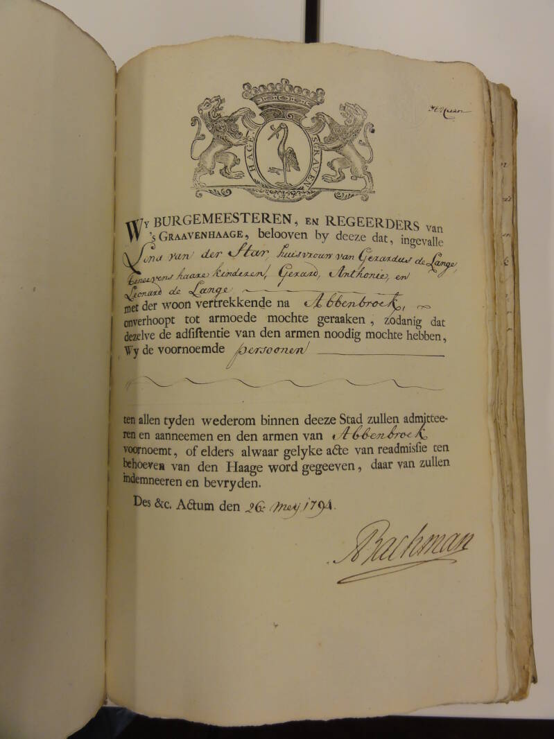 Wy BURGEMEESTEREN, en REGEERDERS van 's GRAAVENHAAGE, belooven by deeze dat, ingevalle Lena van der Star, huisvrouw van Gerardus de Lange beneevens haare kinderen, Gerard, Anthonie, en Leonard de Lange met der woon vertrekkende na Abbenbroek, onverhoopt tot armoede mochte geraaken, zodanig dat dezelve de adsistentie van den armen noodig mochte hebben, Wy de voornoemde persoonen ten allen tyden wederom binnen deeze Stad zullen admitteeren en aanneemen en den armen van Abbenbroek voornoemt, of elders alwaar gelyke acte van readmissie ten behoeven van den Haage word gegeeven, daar van zullen indemneeren en bevryden.