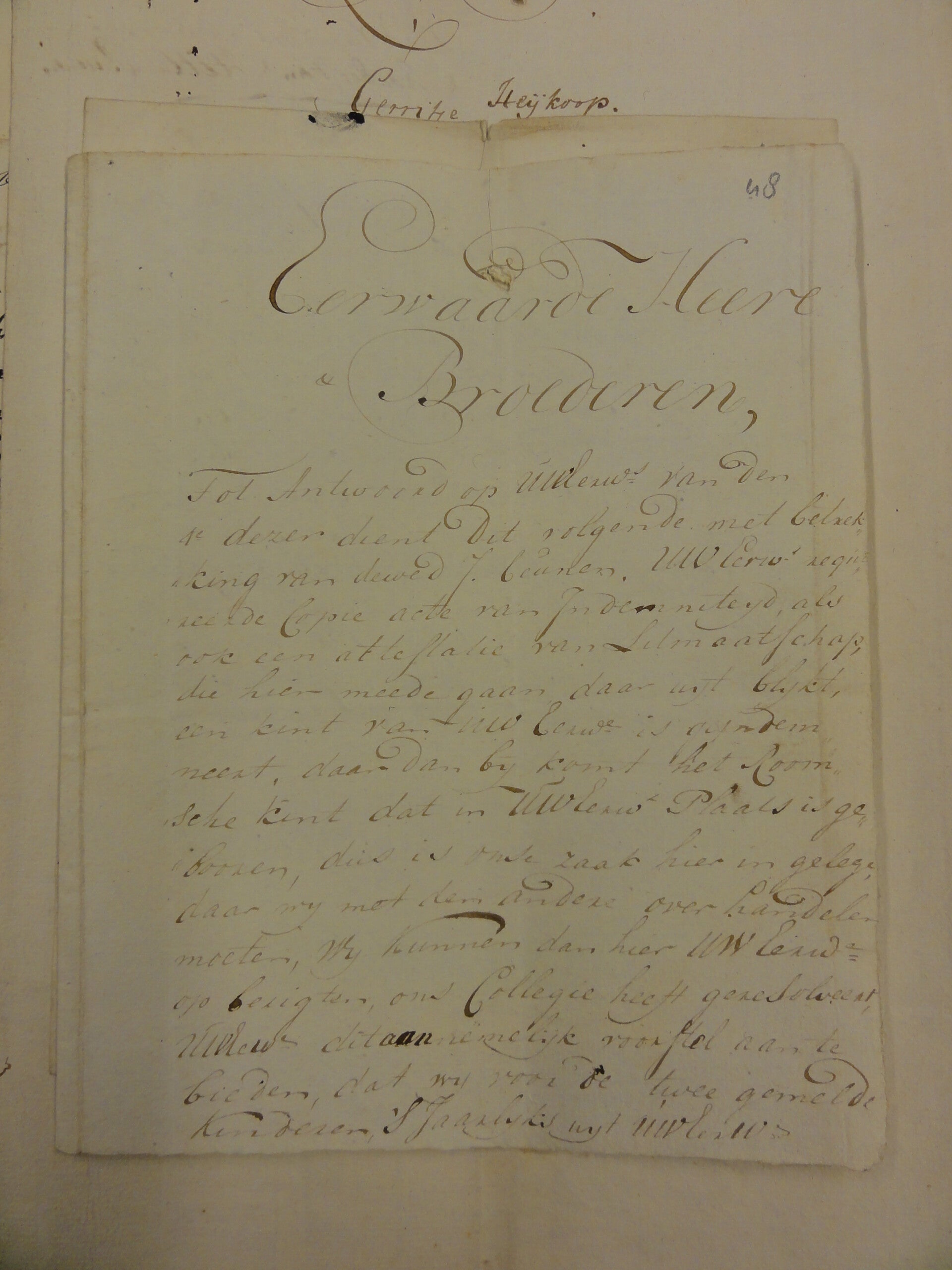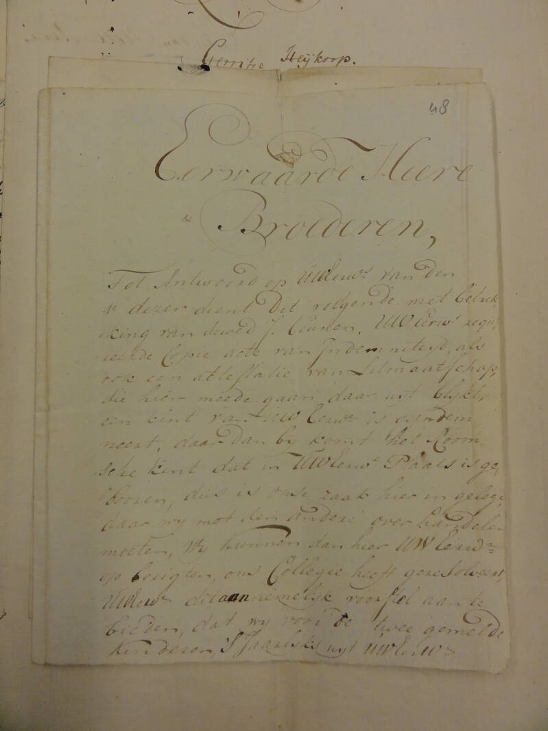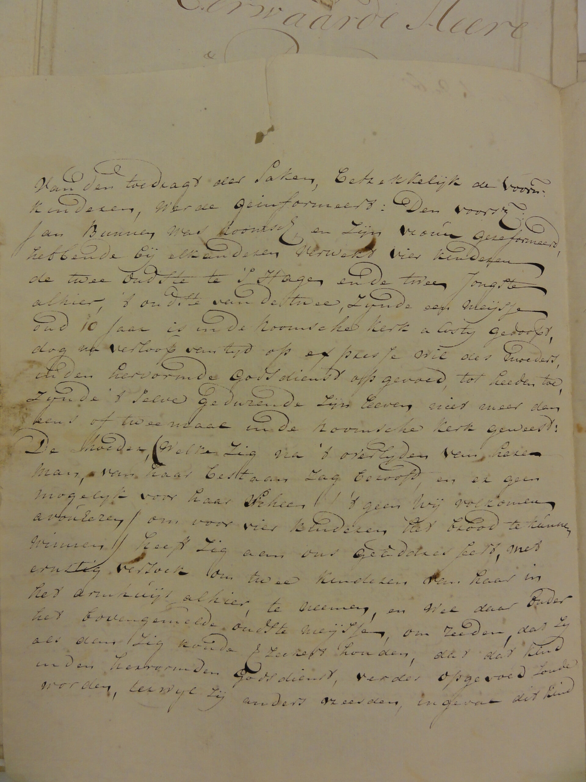 Dat hij comparant, noch zijne tegenwoordige huisvrouw, geene kind, of kinderen, noch afkomeling, of afkomelingen van vooroverledene kind,of kinderen, noch eenige apparentie hebbende om uithoofde van een vergevorderde ouderdom, dezelve te bekomen, aan ’t voornoemde kind alles hebben besteed, wat tot een goede opvoeding overeenkomstig hunne Staat konde ver.. worden en dat daar ’t zelve thans eerstdaags in ’t Huwelijk Staat te treden met iemand die haar fortuin zoude kunnen verbeteren, hij het van zijne plicht heeft geacht om haar bij eene publieke akte met voorkennis en mede weten en speciaale toestemming van zijne voornoemde huisvrouw, als zijn kind te erkennen