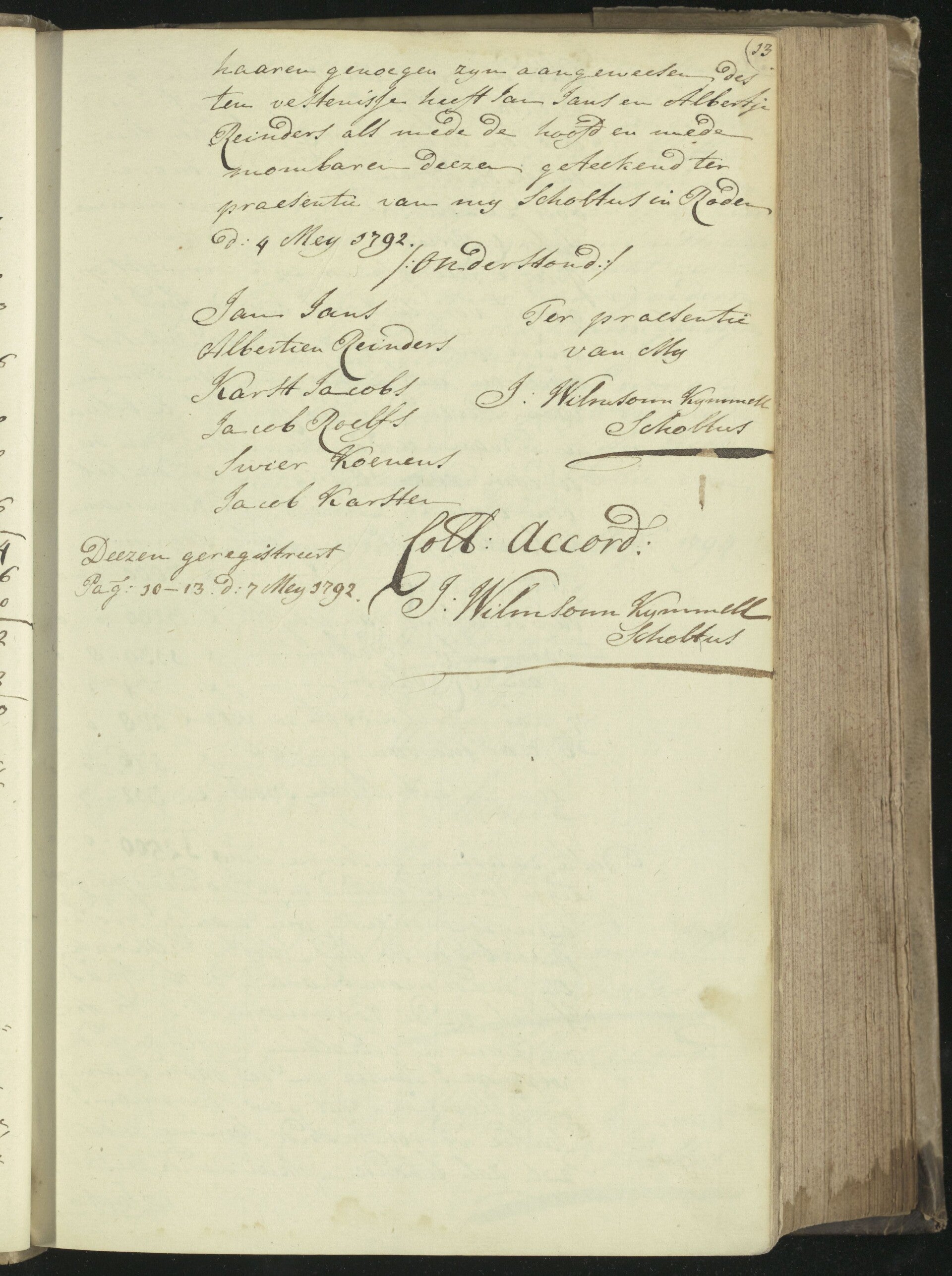 En wordt hiervan uitgegeven Akte gedaan en gepasseert op dato als in het hoofd dezes gemeld, ten huize van Joseph van Muiden, castelein binnen de voornoemde gemeente van Cappelle op d’IJssel in tegenwoordigheid van den weleerwaarden Heer Cornelis Arij van Schagen, predikant der Hervormde gemeente van Cappelle op d’Ijssel voorschreven en Jan Stout arbeider, beide inwoonders der welgemelde gemeente van Cappelle op d’Ijssel