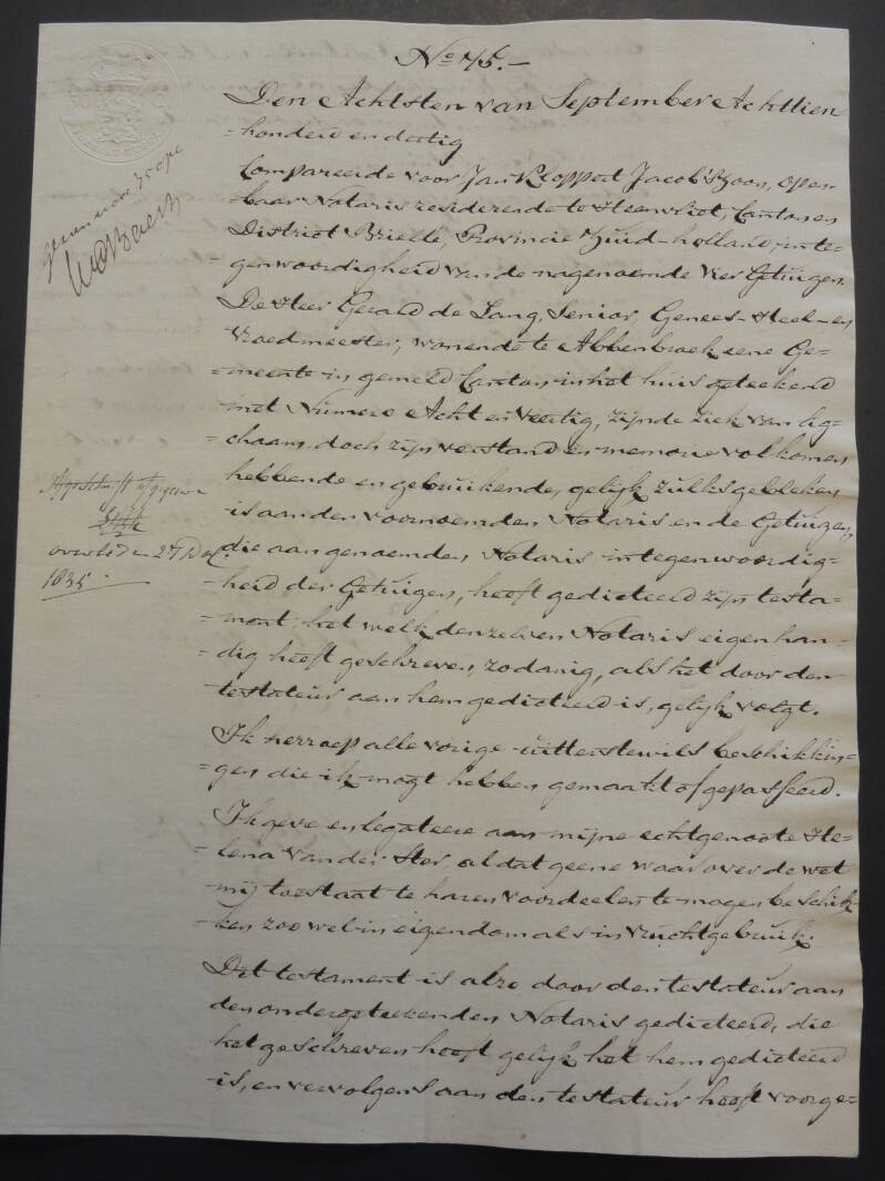 Zoo verklaard hij comparant bij deze tegenwoordige akte, dat Louwrijna geboren te Cappelle op d’IJssel den een en twintigste Julij zeventien Honderd drieennegentig en aldaar gedoopt den vierden Augustus daar aanvolgende, is een kind, hetwelke hij verwekt heeft aan Goverijna Twigt, ongehuwde dochter als toen wonende te Cappelle op d’IJssel voorschreven dat hijzelfs ten tijde der geboorte van Goverijna Twigt en drie honderd dagen tevoren door geen Huwelijksband verbonden is geweest