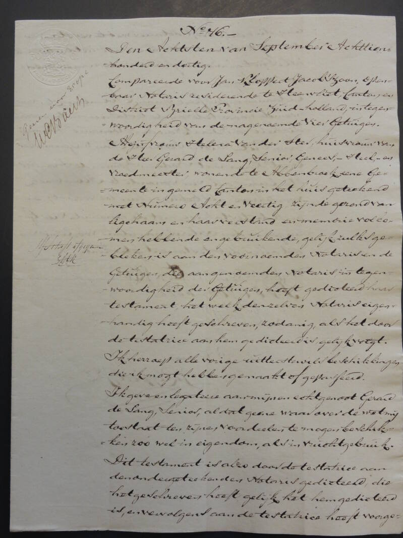 Tekennen gevende dat hij Comparant, voor zijn tegenwoordig Huwelijk op den Een entwintigste Julij zeventien Honderd Drie en negentig, in onegt heeft verwekt een kind aan Goverijna Twigt ongehuwde dochter als toen wonende te Cappelle op d’Ijssel al waar zij Goverijna Twigt op den derden februarij AgtienHonderd is overleden Welk kind is geweest een dochter aan ’t welke is gegeven de naam van Louwrijna